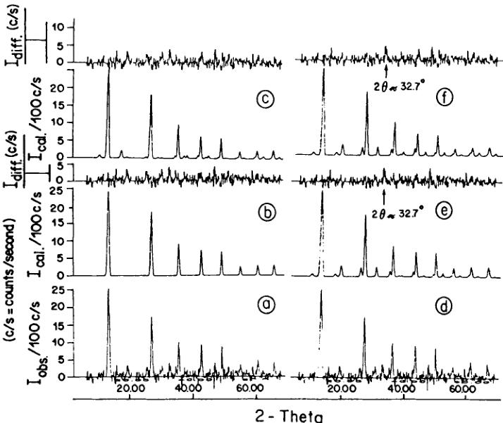 FIGURE 5 a) and d): the difference neutron powder diffraction diagram of \( Ni_{3}B_{7}O_{13}Br \) boracite between 8 and 36 K; b): the calculated neutron intensities of the "basic" magnetic structure model I; c): the calculated neutron intensities of the "basic" magnetic structure model II; e): refined neutron reflection intensities of the magnetic structure models I and the difference intensities of the observed and the calculated intensities; f): refined neutron reflection intensities of the magnetic structure model II and the difference intensities of the observed and the calculated intensities.
