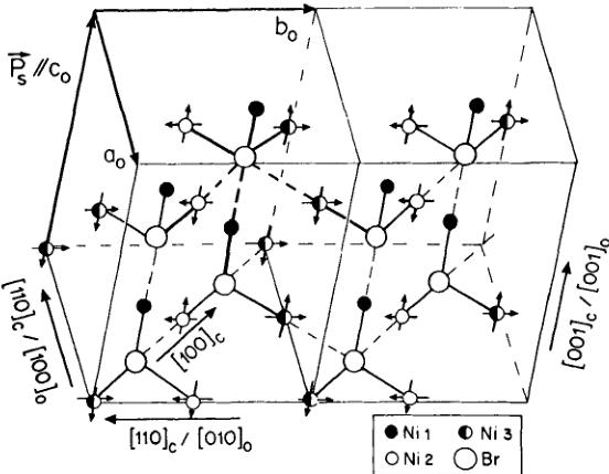 taneous birefringence. \( ^{4-6} \) The crystal structure of the orthorhombic phase at \( T = 293~K \) has been refined by X-ray diffraction on a ferroelectric/ferroelastic single domain crystal. \( ^{7} \) The primitive unit cell volume of orthorhombic Ni—Br boracite doubles at the cubic-to-orthorhombic phase transition with the orientation of \( a_{0} // [\bar{1}10] \) -cubic, \( b_{0} // [110] \) -cubic and \( c_{0} // [001] \) -cubic, where \( a_{0} \) , \( b_{0} \) , \( c_{0} \) denote the orthorhombic axes. The nuclear structure of this phase is stable down to 21 K.