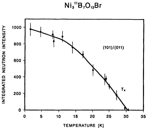 FIGURE 1 Integrated intensity of the magnetic (pseudo)-orthorhombic (101)/(011) neutron reflection of \( Ni_{3}B_{7}O_{13}Br \) boracite as a function of temperature. \( T_{c1} \approx 30 \) K indicates the first magnetic phase transition temperature.