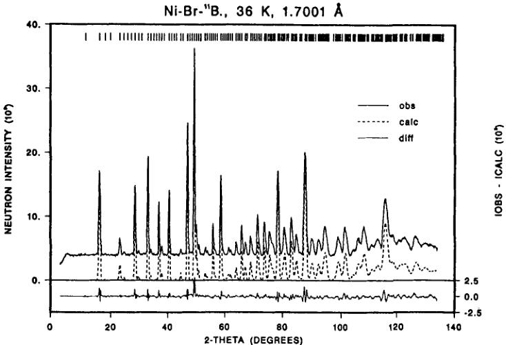 FIGURE 2 Observed, calculated and difference neutron powder diffraction intensities of \( Ni_{3}B_{7}O_{13}Br \) boracite in the paramagnetic state at 36 K (only nuclear contribution).