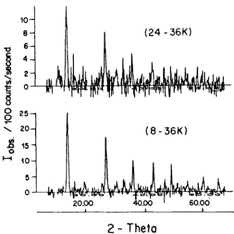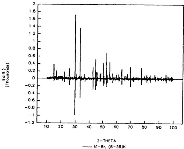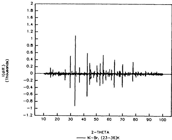 FIGURE 3 X-ray powder diffraction difference intensities (23–36) K and (8–23) K or \( Ni_{3}B_{7}O_{13}Br \) boracite. Differences are mostly due to temperature dependent peak shift.