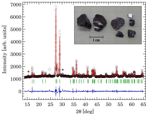FIG. 2. (Color online) Powder x-ray diffraction was measured on crushed single crystals, black for the observed data, red for the calculated pattern, blue for the difference, and green for the Bragg positions. The symbols \( \star \) and \( \diamond \) indicate \( Cu_{0.64}V_{2}O_{5} \) and \( \beta-Cu_{2}V_{2}O_{7} \) impurities, respectively. The inset shows a photograph of the \( \alpha-Cu_{2}V_{2}O_{7} \) single crystals.