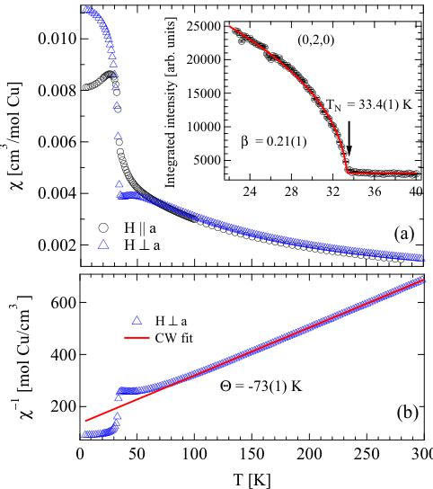 FIG. 3. (Color online) (a) Magnetic susceptibility was measured with the applied field of 1 T parallel \( (H\|a) \) and perpendicular \( (H\perp a) \) to the crystallographic a axis. The inset shows an order parameter as a function of temperature measured by neutron scattering at the magnetic Bragg reflection \( (0,2,0) \) . (b) The Curie-Weiss law (red) is fit to the susceptibility with \( H\perp a \) .