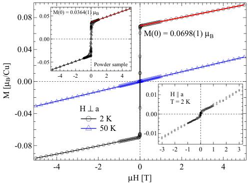 To determine the spin canting and DM parameter on the single-crystal sample, the magnetization measurements as a function of magnetic field up to a maximal field of 5 T were performed with two orthogonal magnetic field orientations, i.e., \( H\|a \) and \( H\perp a \) . Figure 4 shows the magnetization measurement on the single crystal with the applied magnetic field perpendicular to the a axis. Above \( T_{N} \) (T = 50 K) the magnetization is linear throughout the measuring field range. However, below \( T_{N} \) (T = 2 K) starting from zero applied field the magnetization sharply rises to a finite value with only a slight increase in magnetic field before attaining the same linear response as that observed in the 50 K data. The rapid increase of the magnetization, which is indicative of weak ferromagnetism due to the spin canting, is not observed for \( H\|a \) as shown in the lower inset. The small kink around zero field is most likely due to slight misalignment. The same measurements on the power sample show a similar weak ferromagnetic component as shown in the upper inset. However, the jump is less sharp and about a factor of 2 smaller due to powder average. For the single-crystal data, a hysteresis loop, which is typical for ferromagnetism, is not clear with a very small coercive field (<10 Oe, which is the resolution of the measurements), but it is more pronounced for the powder data, possibly due to the powder average over all orientations, which could broaden the magnetization reversal.