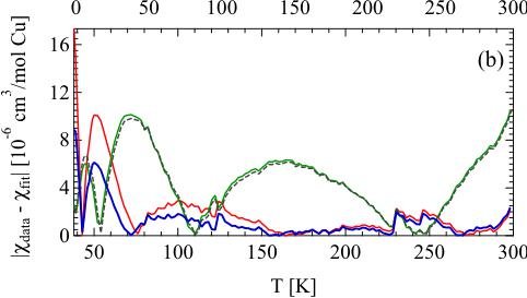 FIG. 5. (Color online) (a) Fit of magnetic susceptibility with \( H \perp a \) to the Bethe ansatz numerical result (black-dashed line), QMC simulations on the uniform spin-chain model (green line), QMC simulations on the helical-honeycomb model with \( J_{1} > J_{2} \) (red), and with \( J_{1} < J_{2} \) (blue). (b) Residual curves \( (\chi_{\mathrm{data}} - \chi_{\mathrm{fit}}) \) between the data and fit curves of different lattice models.