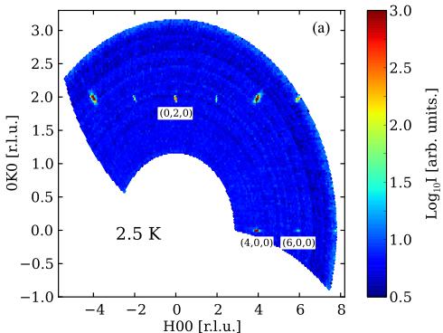 To check crystallinity quality and investigate the magnetic transition, single-crystal neutron diffraction was performed at the BT7 Double Focusing Thermal Triple Axis Spectrometer [28] at NIST Center for Neutron Research, USA, on a single crystal with a mosaic of \( 0.8^{\circ} \) . Elastic neutron scattering were performed at 2.5 and 50 K using fixed incident energies of 14.7 and 30.5 meV. The position-sensitive detector (PSD) was employed in a two-axis mode with open– \( 80^{\prime\prime} \) –sample– \( 80^{\prime\prime} \) (radial)–PSD horizontal collimations to map out the broad reciprocal space in the \( (hk0) \) scattering plane [Fig. 6(a)]. A detailed investigation of the nuclear and magnetic Bragg reflections were performed using a triple-axis mode with a single detector and the horizontal collimations of open– \( 80^{\prime\prime} \) –sample– \( 80^{\prime\prime}-120^{\prime\prime} \) . For all diffraction measurements, one pyrolytic graphite (PG) filter and two PG filters were placed along the incident and scattered beams, respectively, to reduce higher-order neutron contamination. Neutron diffraction on the powder sample
