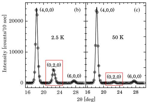 FIG. 6. (Color online) (a) An intensity map of single-crystal \( \alpha \) -Cu \( _{2} \) V \( _{2} \) O \( _{7} \) was measured in the \( (h,k,0) \) plane at 2.5 K. The intensity is presented in a log scale. (b) and (c) show the \( \theta \) -2 \( \theta \) scans around the \( (4,0,0) \) , \( (0,2,0) \) , and \( (6,0,0) \) Bragg reflections at 2.5 and 50 K, respectively. The solid line is a guide to the eye. Error bars represent one standard deviation throughout the article.