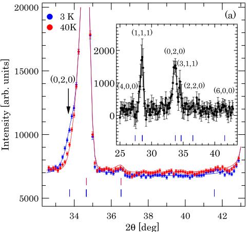 which corresponds to the \( (0,2,0) \) magnetic Bragg reflection. In the inset, the intensity difference between 3 and 40 K data clearly shows the magnetic Bragg reflections at \( (1,1,1) \) , \( (0,2,0) \) , and \( (3,1,1) \) , and negligible magnetic scattering intensities at \( (4,0,0) \) and \( (6,0,0) \) . This absence of magnetic Bragg intensity at the \( (h,0,0) \) reflections is consistent with the single-crystal data discussed previously.
