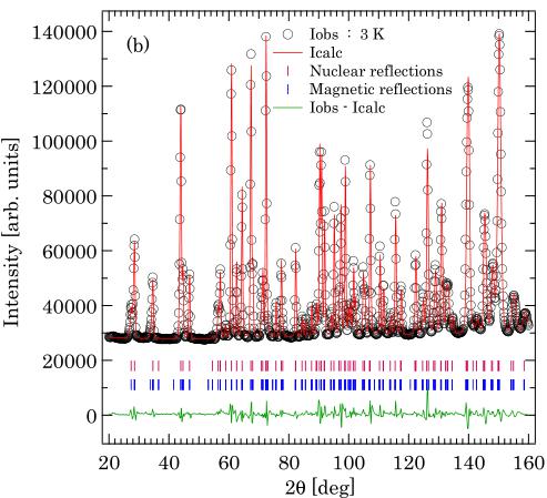 were performed at the high-resolution neutron diffractometer Echidna, ANSTO, Australia using neutrons with wavelength 2.44 Å (13.7 meV). The data were collected at 3 and 40 K to extract the magnetic scattering. Additional single-crystal neutron diffraction measurements were carried out at 4 and 50 K using the Laue diffractometer Koala, ANSTO, Australia. The Laue data images were processed using the LaueG software [29].