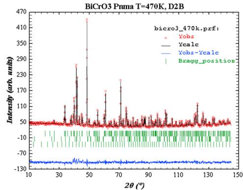 Fig. 1. Rietveld plot for \( BiCrO_{3} \) at 470 K from D2B neutron powder diffraction data.