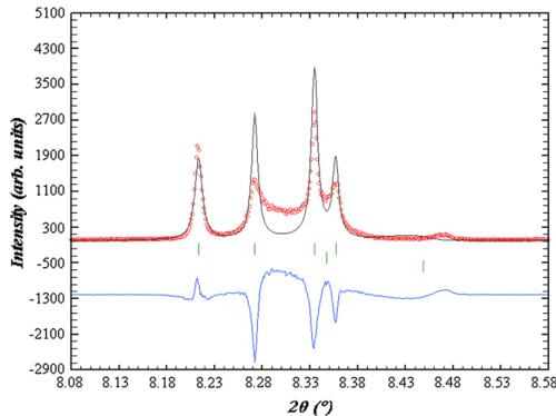 Fig. 3. Part of the synchrotron XRD diffractogram showing the (2 0 2), (-1 1 3), (0 2 o) and (-3 1 1) Bragg reflections around 8.3° (ESRF ID31). The calculated profile is from a tentative LeBail refinement in C2 symmetry.