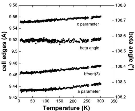 Fig. 5. Structural parameters \( (a,b,c \) and \( \beta) \) from D20 neutron powder diffraction under temperature.
