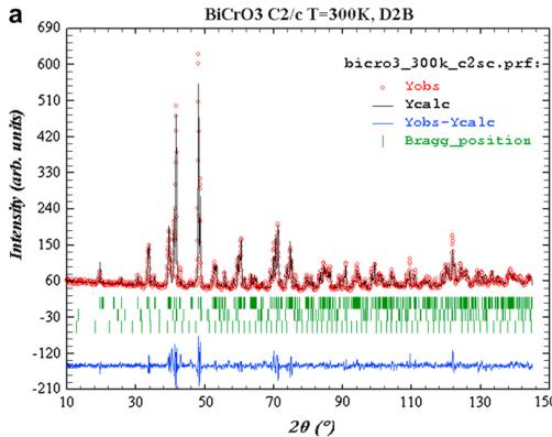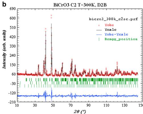 In order to investigate the issue of the existence of an inversion centre in \( BiCrO_{3} \) , the NPD data collected on D2B at room temperature were refined with the C2/c and C2 space groups.