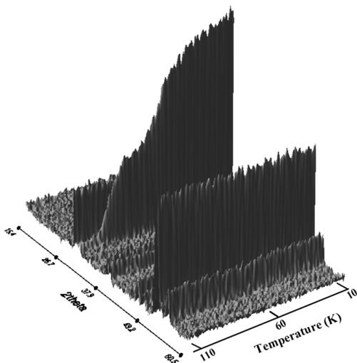 The D20 NPD data at low temperature show the appearance of magnetic contributions into the nuclear Bragg peaks at 114 K on cooling. This is followed by a strong increase in intensity starting at 80 K (Fig. 4). No hysteretic behaviour could be observed on