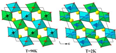Neutron powder diffraction (NPD) data were collected on the D20 and D2B instruments of the Institut Laue Langevin – Grenoble. For the D20 experiment, a 2.41 Å wavelength from the (002) reflection of a HOPG monochromator was used. The sample was put inside a cylindrical vanadium can itself placed in an orange cryostat. The sample was first cooled down to 2 K then heated up to 500 K and brought back to room temperature while powder neutron diffraction data were recorded "on the fly" about every minute. The D2B measurements were carried out at selected temperatures (2 K, 90 K, 130 K, 300 K, 470 K) using a pulse tube cryostat with a 1.59 Å wavelength from a Ge(335) monochromator. In order to optimize spatial resolution, only the central part in the axial direction of the 2D detector data was integrated. All refinements were done using the WinplotR/Fullprof software [14].