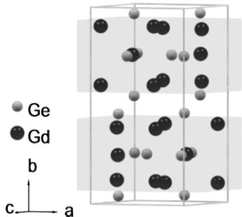 FIG. 1. The crystal structure of \( Gd_{5}Ge_{4} \) . Shaded regions indicate the Gd-rich “slabs” stacked along the b direction.