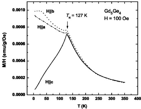 Single crystals of \( Gd_{5}Ge_{4} \) were grown using the Bridgman technique. \( ^{[12]} \) For the XRMS measurements, single crystals were extracted from the ingot and prepared with polished surfaces perpendicular to the crystallographic a and b axes, with a size of approximately \( 2 mm \times 2 mm \) . The temperature dependence of the magnetization was measured with a SQUID magnetometer and is shown in Fig. 2. These data clearly show an antiferromagnetic transition at \( T_{N}=127 K \) , and indicate that the magnetic moment direction is likely along the c axis since the magnetization in c direction decreases to zero as temperature decreases to the base temperature. These results are in agreement with previous magnetization measurements. \( ^{[13]} \)