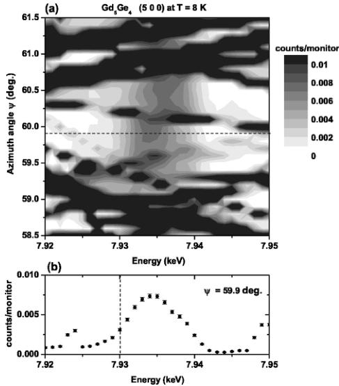 FIG. 3. (a) Contour map of the intensity as a function of energy and azimuth angle \( \psi \) at the \( (5\ 0\ 0) \) position and T=8 K. Discontinuities in the bands of multiple scattering across the energy range are artifacts of the scanning process and (b) single energy scan at the azimuth angle \( \psi=59.9^{\circ} \) , which is depicted as a horizontal dashed line in (a). In (b), the vertical dashed line represents the position of the Gd \( L_{II} \) absorption edge.