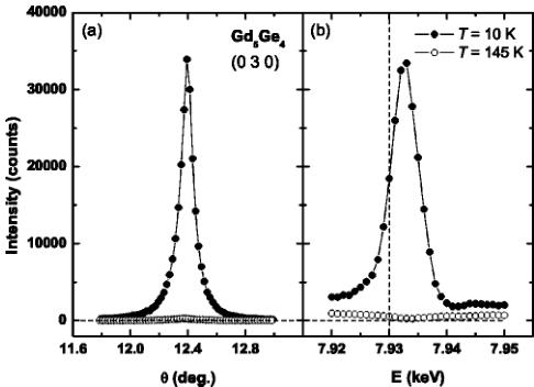 Details of the microscopic magnetic structure of \( Gd_{5}Ge_{4} \) or, in fact, any of the \( \mathrm{Gd}_{5}(\mathrm{Si}_{x}\mathrm{Ge}_{{1-x}})_{4} \) alloys have not been determined largely due to the large neutron absorption cross section of naturally occurring Gd. The aim of the present measurement is to elucidate the antiferromagnetic structure of \( Gd_{5}Ge_{4} \) using x-ray resonant magnetic scattering (XRMS).