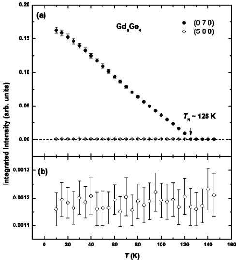 With the sample at low temperature and oriented so that the b-c orthorhombic axes were coincident with the scattering plane, a strong magnetic reflection was found at the nominally forbidden \( (0\ 3\ 0) \) charge reflection position as illustrated in Fig. 4(a). The full-width-half-maximum of the magnetic peak measured in \( \theta \) scans (rocking curves) was \( 0.1^{\circ} \) , the same as that from charge scattering. In order to confirm that the scattered intensity does indeed arise from resonant magnetic scattering, energy scans through the Gd \( L_{II} \) absorption edge were performed above and below the Néel temperature [see Fig. 4(b)]. At T=145 K, only charge scattering, arising from the tails of multiple scattering peaks, was observed. At low temperature, however, there is clear evidence of strong resonant scattering at the \( (0\ 3\ 0) \) magnetic peak position. Figure 5(a) displays the temperature dependence of the integrated intensity of the \( (0\ 7\ 0) \) magnetic peak. A Lorentzian peak shape was used to fit \( \theta \) scans through the reciprocal lattice points to obtain the integrated intensities. The intensity decreases smoothly to zero as temperature increases up to T=125 K. Magnetic reflections were found only at reciprocal lattice points \( (0\ k\ 0) \) , where k is odd. Therefore, the magnetic unit cell is the same as the crystallographic unit cell.