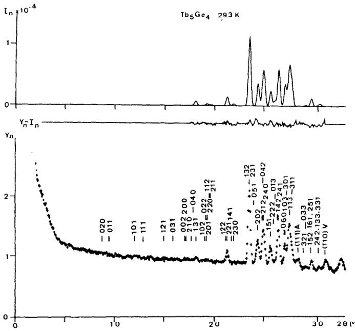 Fig. 1. Neutron diffraction pattern from paramagnetic (293 K) \( Tb_{5}Ge_{4} \) . The full curve is the calculated profile. \( Y_{n}-I_{n} \) is the difference diagram. The curve with crosses shows the measured intensities corrected for absorption.