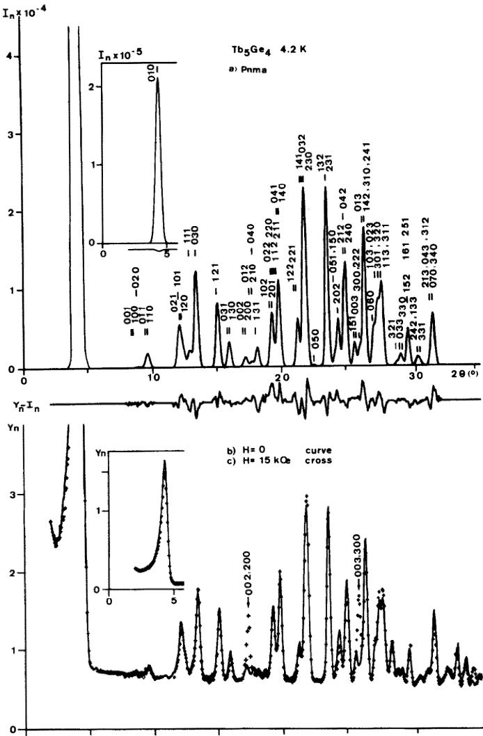 A powder sample was prepared by arc melting of the elements (Johnson and Matthey; Tb, 99.99%, Ge 99.999%) in an argon atmosphere, remelting several times, and finally annealed at \( 1580^{\circ} \) C in a Ta crucible under vacuum for 24 hr. Small single crystals were produced and analyzed to be \( Tb_{5}Ge_{4} \) . X-Ray powder data collected with a Guinier focusing camera ( \( CuK_{\alpha} \) ) showed no other phases. Neutron diffraction data ( \( \lambda \) 1.14 Å) were collected with a powder diffractometer at the EL-3 reactor in Saclay. The sample was contained in a vanadium cylinder 8 mm in diameter. Three sets of intensity data were measured, one at room temperature and the other two at 4.2 K with and without a magnetic field of 15 kOe, applied along the scattering vector. The data were corrected for absorption. The measured \( \mu R = 0.99(1) \) factor was surprisingly high, indicating the presence of a high absorbing rare earth impurity. Figures 1 and 2 display the data after absorption corrections were applied.