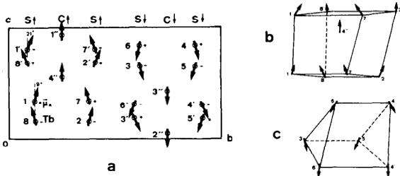 The structure is antiferromagnetically compensated through a sign change over the antisymmetry center. The magnetic moment values (7.1, 8.4, 7.7[ \( \mu_{B} \) ]) of the 3 Tb non-equivalent positions are near the saturation value of the free ion and indicates that it is not reduced by crystalline field effects, as might have been assumed from the \( T_{N} \) and the low symmetry. The different magnetic moment directions and the canted spin arrangement of this structure is most likely resulting from (a) the different influence of the crystalline field on the three equivalent positions and (b) the possibility of an antisymmetric exchange term of the Dzialoshinski–Moriya kind in the Hamiltonian that can be expected in the case of such a low crystal symmetry \( ^{[19]} \) . The exchange interactions here, as for most rare earth alloys, are expected to take place via the conduction electrons.