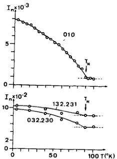 The very strong intensities of the superstructure lines (010), (030) and (070) allow preliminary statements to be made concerning the magnetic structure. The magnetic structure is most probably two-dimensional, with the moments of the magnetic atoms almost confined to the (010) plane. Since there is no ferromagnetism, each one of the three non-equivalent positions might have an antiferromagnetic arrangement. In addition the crystallographic mirror plane m becomes an antisymmetry mirror plane \( m' \) for the 4(c) atoms having their moments in