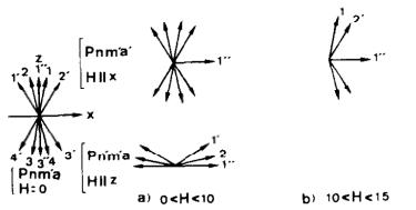 The signs of the Tb (1, 2) moments along the main axis of antiferromagnetism are opposite for \( Pn'm'a \) (along x) and the same for \( Pnm'a \) (along z). For the rest of the signs see Table 3. In Fig. 6 this transition is shown to occur in region (a) for very low fields. This mechanism was the only one that could explain the strong intensity of (003) in Table 5; we expect that the (003) intensity will fall to zero for higher fields.