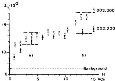 Since the magnetic cell is pseudotetragonal ( \( a \cong c \) ), it was not possible to follow separately the field influence along the x and z directions. Therefore the critical fields (at least 6) could not be derived from the transitions associated with the 10 sublattice cross structure of \( Tb_{5}Ge_{4} \) . Figure 6 shows that the observed neutron intensities of the (002) + (200) and (003) + (300) lines both increase with the field but each with a different slope for very low field values. They achieve saturation at 5 kOe. At about 10 kOe (region b) a second transition with a less steep slope is visible but not saturation is achieved up to 15 kOe. In fact from pulsed field measurements† the ferromagnetic transition is found to occur in fields much higher than 15 kOe.