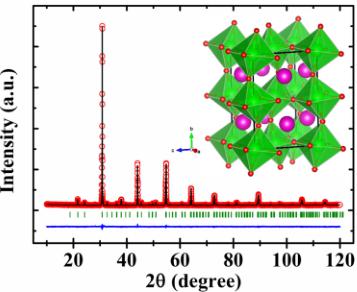 Figure 1(a) shows the Rietveld refinement of the x-ray diffraction pattern of polycrystalline \( EuZrO_{3} \) collected at room temperature using monochromatic (Cu \( K\alpha_{1} \) ) radiation. From the Rietveld refinement it is confirmed that this compound has an orthorhombic perovskite structure with the space group Pnma at room temperature. The sample contains a small amount of \( Eu_{2}Zr_{2}O_{7} \) as an impurity phase. \( EuZrO_{3} \) does not show any symmetry lowering or structural phase transition down to 10 K. \( EuTiO_{3} \) shows a structural phase from cubic \( Pm\bar{3}m \) to a tetragonal 14/mcm structure at 235 K [14]. Neutron diffraction data of \( EuZrO_{3} \) also show that the compound retains the orthorhombic space group Pnma down to the lowest temperature (T = 1.5 K), which will be discussed later. For the structural refinement, we have used the Pnma standard settings where Eu, Zr, O1, and O2 are located at the 4c, 4a, 8d, and 4c Wyckoff sites respectively. The structure of \( EuZrO_{3} \) consists of corner shared \( ZrO_{6} \) octahedra forming a perovskite network with the \( Eu^{2+} \) ions occupying the interstitial sites as shown in the inset of Fig. 1(a). In \( EuZrO_{3} \) the smaller tolerance factor, as compared to \( EuTiO_{3} \) leads to a rotation of the \( ZrO_{6} \) octahedra, resulting in a \( GdFeO_{3} \) type structural distortion.