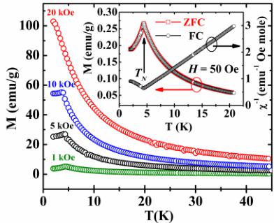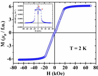 Temperature-dependent DC magnetization measurements on \( EuZrO_{3} \) at different magnetic fields are shown in Fig. 1(b). The temperature-dependent zero-field-cooled (ZFC) and field-cooled (FC) data recorded in the presence of an applied magnetic field of 50 Oe show a sharp kink at 4.4 K without any divergence between the ZFC and FC data down to our lowest temperature, as shown in the inset of Fig. 1(b). The kink at 4.4 K indicates the second-order magnetic phase transition from the paramagnetic to the antiferromagnetic state, which is also evident from the inverse susceptibility vs temperature plot shown in the inset of Fig. 1(b). Interestingly, the sharp kink gradually becomes broader with increasing magnetic field and it completely disappears at about 20 kOe, as is evident from the temperature-dependent magnetization data shown in Fig. 1(b). Isothermal magnetization data as a function of magnetic field recorded at 2 K [Fig. 1(c)] shows approximately linear behavior up to 20 kOe and then it tends toward saturation, indicating the appearance of a ferromagnetic state with the saturation magnetization value around \( 6.2\mu_{B} \) per formula unit, which is close to the spin-only moment of \( Eu^{2+} \) ( \( 7\mu_{B} \) ) ions. From Fig. 1(c) we see that initially the slope of the M vs H curve increases with magnetic field and then the slope changes at around 5 kOe, which is prominent from an inspection of the derivative plot as shown in the inset of Fig. 1(c). This phenomenon is similar to the spin-flop transition, where spins start orienting from the antiferromagnetic to ferromagnetic state. This continues with