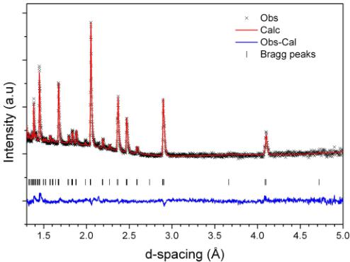 FIG. 2. The Rietveld refinement of the neutron data acquired at T = 10 K. The black crosses represent the neutron data and the red and blue lines represent the calculated spectrum and its difference to the data respectively. The black lines show the positions of the Bragg peaks. The agreement factors are \( R_{p} = 1.82\% \) , \( R_{wp} = 2.03\% \) , and Goodness of Fit, GoF = 1.65.