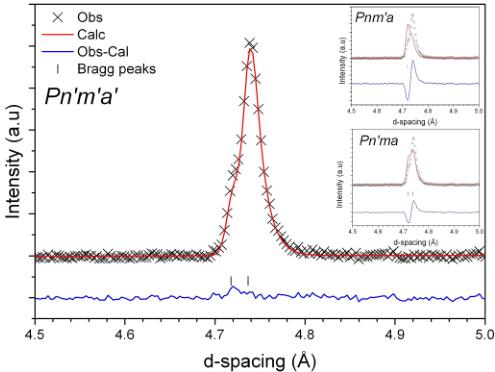 FIG. 3. The experimental data (black) for the (110) and (011) reflections. In the main panel's Rietveld refinement, the red and blue lines represent the calculated spectrum and its difference from the data respectively. The neutron data were acquired at \( T = 1.5 \, K \) . The refinement indicates the alignment of spins on the \( Eu^{2+} \) ions along the c axis ( \( Pn'm'a' \) ). The right inset shows the calculated profile assuming that the spins are oriented along the a axis ( \( Pnm'a \) ) or b axis ( \( P'n'ma \) ), upper and lower curves respectively. Both of these models fail to accurately represent the data.