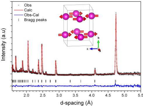 FIG. 4. The Rietveld refinement of the neutron data acquired at \(T=1.5\ \mathrm{K}\). The black crosses represent the neutron data and the red and blue lines represent the calculated spectrum and its differences from the data respectively. The black lines show the positions of the Bragg peaks. The inset shows a schematic of the \(G\)-type magnetic structure in the \(Pn'm'a'\) magnetic space group. The agreement factors are \(R_{p}=1.99\%\), \(R_{wp}=2.25\%\), and GoF=1.62.