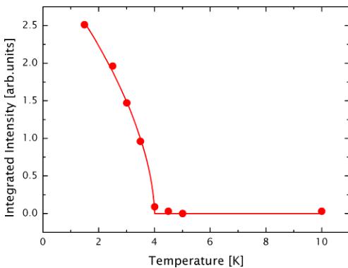 Finally, we now analyze the magnetic scattering as the temperature is lowered by plotting the background corrected integrated intensity of the (110) and (011) peaks combined, as shown in Fig. 5. The obtained data have been fitted with a power law (the red curve) of the form \( I \propto \left(\frac{T - T_{c}}{T_{c}}\right)^{2\beta} \) yielding a \( T_{c} \) of 4.0(1) K and \( \beta = 0.29(4) \) . The critical exponent \( \beta = 0.29(4) \) is consistent with the asymptotic three-dimensional (3D) Ising model. It may be noted here that the