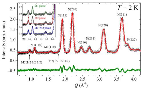 FIG. 4. The neutron diffraction pattern of the parent compound, \( NiS_{2} \) , collected at 2 K. The open black circle and solid red line correspond to the observed and calculated intensities. The inset shows the fitted magnetic peaks with either M1 or M2 structure, and combined \( M1 + M2 \) structures.