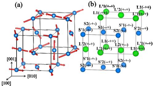 Previous studies argued for the presence of a weak ferromagnetic component along with the M2 phase [24]. It is puzzling to see how a simple binary compound can demonstrate such a complex magnetic state. The four determined magnetic structures, although complex, cancel out in total. Thus there is no weak ferromagnetic component in this model, nor should it exist based on the \( Pa\bar{3} \) symmetry from the magnetic point group theory analysis. At the same time, along the a axis, the spin components do not cancel out in the planes with all S spins and all L spins even though they cancel out in total. Thus a slight change of the magnetic structure can cause a weak ferromagnetic component. Therefore, the key to differentiating between the four magnetic structures may involve looking at spin waves.