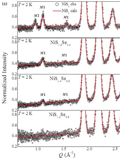 Polarized and unpolarized neutron scattering measurements on single crystals \( [4,7] \) were inconclusive of the spin configuration. Of the 12 kinds of domains the M2 magnetic structure can have, it has not been possible to distinguish its spin arrangement even by polarized neutron scattering. More recently, a single-crystal x-ray diffraction measurement showed that a \( (\frac{1}{2}\frac{1}{2}\frac{1}{2}) \( superlattice peak is present at the M2 transition \) [8] \( . The presence of the superlattice peak has been attributed to charge ordering, with the possibility of coexistence with the M2 magnetic structure. Since both the M1 and M2 structures are antiferromagnetic, a condition is utilized here that allows them to coexist on the fcc Ni sublattice and enables us to solve the magnetic structure of both phases. Thus, we focus on the magnetic structure determination of the M1 and M2 phases using neutron scattering and magnetic point group theory. ## II. EXPERIMENT Four samples with x = 0, 0.4, 0.6, and 0.8 of about 2 g each were measured using neutron powder diffraction. Handling of all starting materials was performed in the glove box under an inert Ar atmosphere. Ni powder (Alfa Aesar, 99.8%) was used as received. Pieces of S (Mation, 99.999%) and Se (Alfa Aesar, 99.999%) were ground to a fine powder with a mortar and pestle prior to use. Polycrystalline samples of \( NiS_{2-x}Se_{x} \) were prepared from stoichiometric mixtures of the elements (a slight excess of S was utilized to prepare phase-pure \( NiS_{2} \) ). The reaction mixtures were thoroughly ground together with a mortar and pestle and then loaded into thick-walled quartz tubes that were sealed under vacuum. Due to the volatility of S, the x = 0 sample was prereacted at lower temperatures of 400, 600, and 700 °C, respectively, with intermediate grinding. It was then annealed at a final temperature of 730 °C for 13 h. The x = 0.4, 0.6, and 0.8 samples underwent two cycles of heating directly at 730 °C.