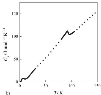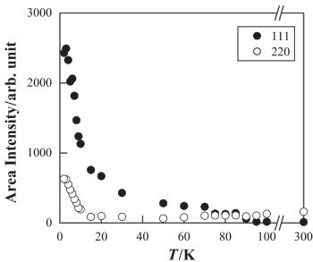 reflections are due to a magnetic origin. The temperature dependence of the integrated intensities of the 111 and 220 reflections is shown in Fig. 3(b). The intensities of these reflections, especially for the 111 reflection, become stronger with decreasing temperature, when the temperature is decreased through 90 K. The temperature for the onset of the increase found in the intensity vs. temperature curves ( \( \sim95 \) K) corresponds to the temperature for the \( \lambda \) -type anomaly found in the specific heat vs. temperature curve (Fig. 1b).
