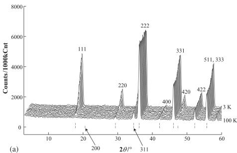 Powder neutron diffraction patterns were collected at several temperature points from room temperature to 3 K in the angle range \( 3^{\circ} \leqslant 2\theta \leqslant 153^{\circ} \) at intervals of \( 0.1^{\circ} \) with a wavelength of 1.8196 Å. Measurements were performed on the Kinken powder diffractometer for high efficiency and high resolution measurements, HERMES, of the Institute for Materials Research (IMR), Tohoku University [11], installed at the JRR-3M Reactor in the Japan Atomic Energy Research Institute (JAERI). The fine powder sample was sealed in a vanadium cylinder with helium gas, and was mounted on the cold head of a closed cycle He-gas refrigerator.