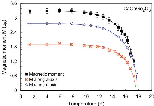 The fits to the temperature dependence of the intensity data of the \( (010) \) and \( (100) \) with the powder law \( I_{hK}(T)=\mathbb{C}[1-(T/T_{N})^{2}]^{c} \) [34] yield a critical exponent of \( \beta=0.44(2) \) and \( T_{N}=17.7(3) \) K for both Bragg reflections. As for hedenbergite, the transition temperature found from neutron diffraction is slightly lower than the one derived from magnetization measurements. Based on the similarity of powder diffraction data in the ordered state, solution of the magnetic structure of \( CaCoGe_{2}O_{6} \) was first tested with the model obtained for \( CaFeSi_{2}O_{6} \) . Indeed the magnetic structure of the Co-germanate can be solved with this model and shows a FM coupling of moments within the M1 chain, neighbouring infinite M1 chains are AFM coupled. The magnetic moments lie within the a-c plane, with the component moment \( M_{z}=2.75(5)\mu_{B} \) being larger than the one along \( M_{\chi}=1.92(4)\mu_{B} \) at 1.4 K. The resulting magnetic moment is \( 3.28(5)\mu_{B} \) , a value close to the theoretical spin-only value of \( Co^{2+} \) . Within the a-c plane, the effective magnetic moment forms an angle of \( 54.2^{\circ} \) with the a-axis and \( 50.6^{\circ} \) with the c-axis (Fig. 9); this orientation does not change as a function of temperature. The magnetic structure of the \( CaCoSi_{2}O_{6} \) is rather similar to the one of the Co-germanate. In \( CaCoSi_{2}O_{6} \) the magnetic moments are also aligned within the a-c plane, forming an angle of \( 41^{\circ} \) with the a-axis, the effective moment was found to be \( 3.30\mu_{B} \) [22,23]. A fit to the temperature dependence of the magnetic moment data of \( CaCoGe_{2}O_{6} \) using the power law \( M(T)=M(0)[1-(T/T_{N})^{2}]^{\beta} \) yields \( T_{N}=17.7(2) \) , \( \alpha=3.65(3) \) and \( \beta=0.44(1) \) . A fit in the critical region \( T_{N}-10K \) only gives a critical exponent of \( \beta=0.37(2) \) . From this the magnetic ordering in \( CaCoGe_{2}O_{6} \) can clearly be described within a 3D model also.