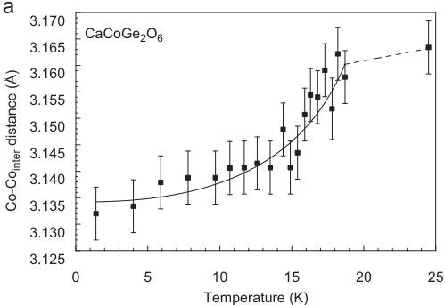 Similar to hedenbergite, structural parameters in \( CaCoGe_{2}O_{6} \) display discontinuities close to the magnetic phase transition. These, however, are not as distinct as in hedenbergite. While the Co–O2 bond length remains almost constant, both Co–O1 bond lengths become shorter in the vicinity of the magnetic phase transition. This also is reflected in the average Co–O bond length. The Co–O1–Co angle is \( 95.1^{\circ} \) , which is the largest value of all compounds investigated here, and it shows no detectable variation with temperature. Some distinct non-linear temperature dependencies are found for the Co–Co interatomic distances: Co–Co atoms within the M1 chain move closer to each other (Fig. 10a), while the shortest distance between Co atoms of two neighbouring chains becomes larger (Fig. 10b). This is opposite to the trend found in hedenbergite. Individual and average Ge–O