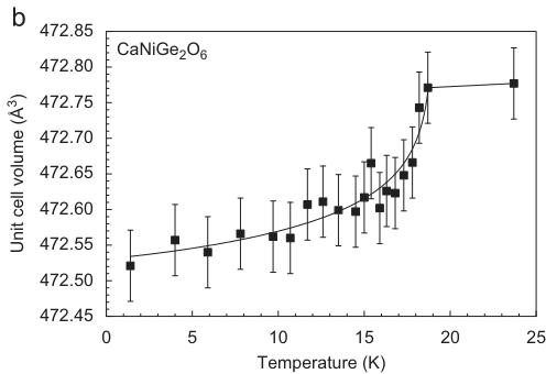 For \( CaNiGe_{2}O_{6} \) , the neutron diffraction experiments were performed in a temperature range between 1.4 and 23.7 K. As for the two previous compounds, some non-linear variations of lattice parameters are observed in the vicinity of the magnetic phase transition, most evident for the b- and c-parameters, with the unit cell of the magnetically ordered phase becoming shrunk (Fig. 11).