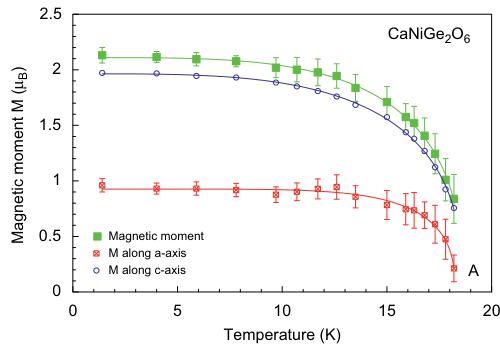moment is \( 2.09(4)\mu_{\mathrm{B}} \) being distinctly lower than the theoretical spin-only value of \( \mathrm{Ni}^{2+} \) ( \( 2.83\mu_{\mathrm{B}} \) ). Within the a-c plane, the magnetic moment forms an angle of \( 63.7^{\circ} \) with the a-axis and \( 41.5^{\circ} \) with the c-axis (Fig. 12). A fit to the temperature dependence of the magnetic moment data of \( CaNiGe_{2}O_{6} \) yield \( T_{\mathrm{N}} = 17.7(2) \) , \( \alpha = 3.65(3) \) and \( \beta = 0.44(1) \) consistent with a 3D ordering.