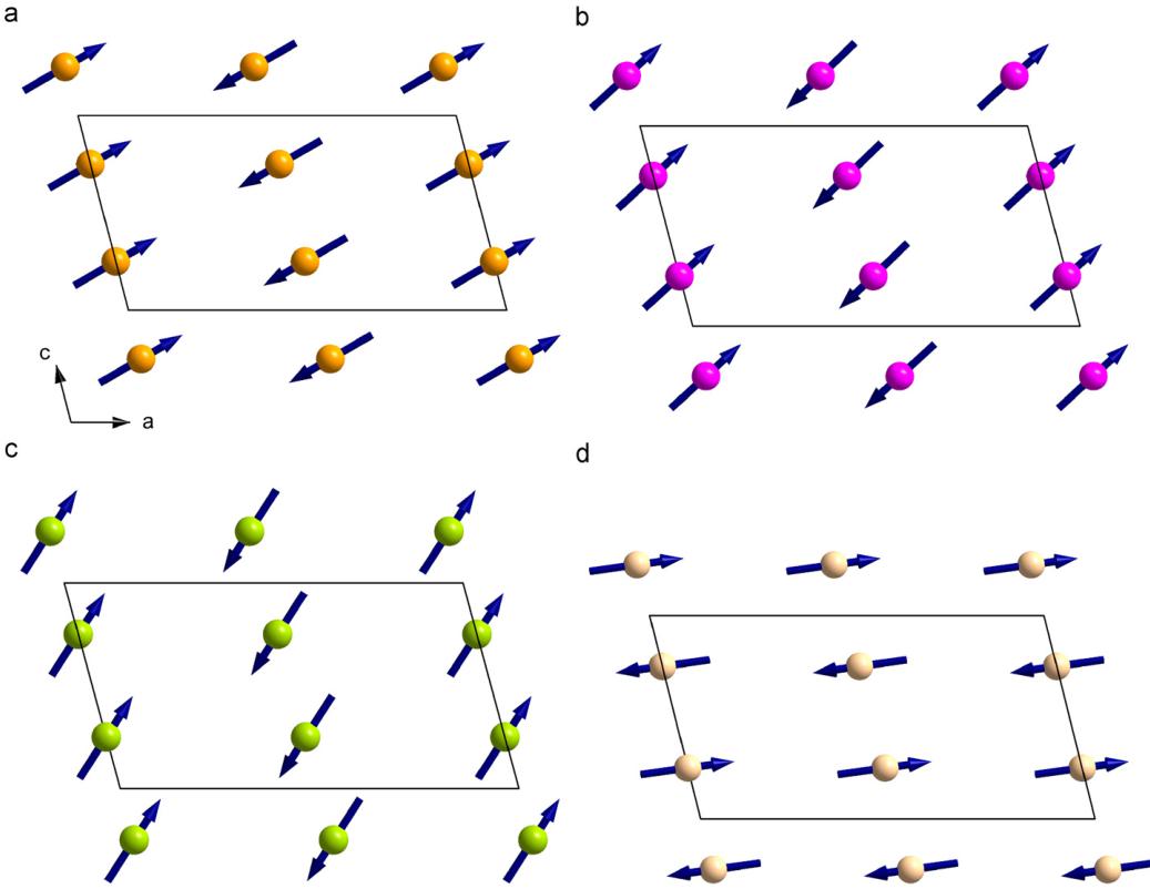 Fig. 15. Comparison of the spin structures for (a) CaFeSi₂O₆, (b) CaCO₆e₂O₆, (c) CaNiGe₂O₆ and (d) CaMnGe₂O₆ at 1.4 K within the a–c plane.