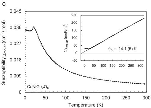 At 10 kG the magnetic susceptibility \( \chi_{molar} \) of synthetic \( CaNiGe_{2}O_{6} \) (Fig. 1c) shows a maximum at 20.6 K, the point of inflection is located at 18.1 K. The Néel temperature is almost identical to \( CaNiSi_{2}O_{6} \) , where the point of maximum inclination in the susceptibility is reported at 20.2 K [29] and 21.7 K [23], respectively. The inverse magnetic susceptibility shows Curie–Weiss behaviour above 80 K, the fitting of a regression line to the data in the paramagnetic range yields a negative paramagnetic Curie temperature of \( \theta_{P} = -14.1 \) K and an effective magnetic moment \( \mu_{CW} = 3.39 \mu_{B} \) , which is again higher than the spin-only value for \( Ni^{2+} \) (2.83 \( \mu_{B} \) per \( Ni^{2+} \) cation). The negative \( \theta_{P} \) for the \( Ni^{2+} \) germanate is in contrast to the positive ones for the \( Fe^{2+} \) and \( Co^{2+} \) compounds and also to the silicate analogue \( CaNiSi_{2}O_{6} \) . In the latter compound, a positive paramagnetic Curie temperature of \( +27.6 \) K [29] and \( +31 \) K [22], respectively, is reported. The effective magnetic moment in the latter two studies is 2.77 and \( 2.82 \mu_{B} \) , close to the theoretical spin-only value. Similar to \( CaCoGe_{2}O_{6} \) , the field dependence of the magnetization at fixed temperatures is strictly linear in the accessible field range up to 55 kG for \( CaNiGe_{2}O_{6} \) .