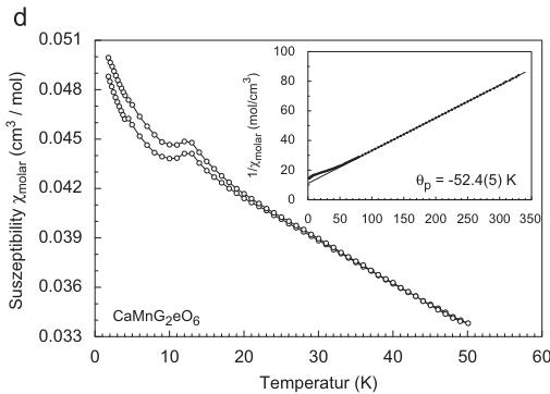 magnetization (Fig 1d). At higher external fields, only a very weak "bump" can be detected. At low external fields, however, a well-developed peak is observable (Fig. 1d), marking the onset of magnetic ordering. The peak susceptibility is observed at 12.4(2)K, while the point of inflection is found at 11.5(2)K. The inverse magnetic susceptibility strictly follows a Curie–Weiss behaviour above 50K and from this the paramagnetic Curie temperature is determined to be strongly negative with \( \theta_{P} = -52.4(5) \) K and the effective magnetic moment \( \mu_{CW} = 6.04 \mu_{B} \) per \( Mn^{2+} \) cation. This suggests a strong AFM ordering in \( CaMnGe_{2}O_{6} \) .