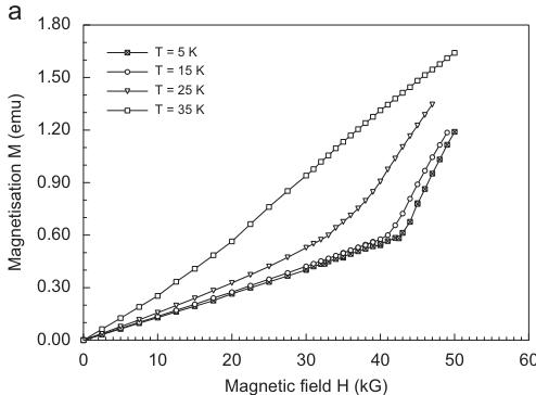 dependence of \( T_{N} \) . While at 1 kG the point of inflection is observed at 35.8 K, it is 23.7 at \( H_{ext} = 50 \) kG, the highest field we could apply (Fig. 2). The paramagnetic Curie temperature \( \Theta_{P} \) (38.9–40.5 K) and the Curie constant \( C_{m} \) however remain almost constant.