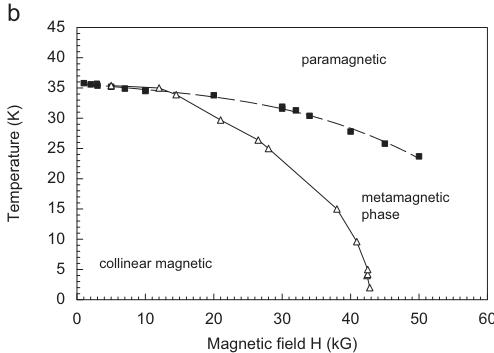 The magnetization \( M = f(H) \) at 2 K is linear up to a critical field of 42.5 kG, at higher fields a sharp kink is observed. This behaviour can be interpreted either as a spin-flop or as a meta-magnetic transition. A spin-flop transition is found e.g. in the structurally isotypic silicate \( CaCoSi_{2}O_{6} \) [23], however occurring at much lower critical fields of 12.5 kG. High field measurements on the same synthetic hedenbergite sample studied here, indicate that at \( H_{ext} \sim 120 \) kG saturation is reached, however linear regression curves fitted to the high field magnetization data do not cross the zero field/zero temperature origin [28]. Thus it is preferred to ascribe the observed kink in the field-dependent magnetization of hedenbergite to a meta-magnetic transition. The critical field of the meta-magnetic transition decreases with increasing temperature. This is evident from the \( T-H_{ext} \) phase diagram, which could be constructed from the available data. (Fig. 2b).